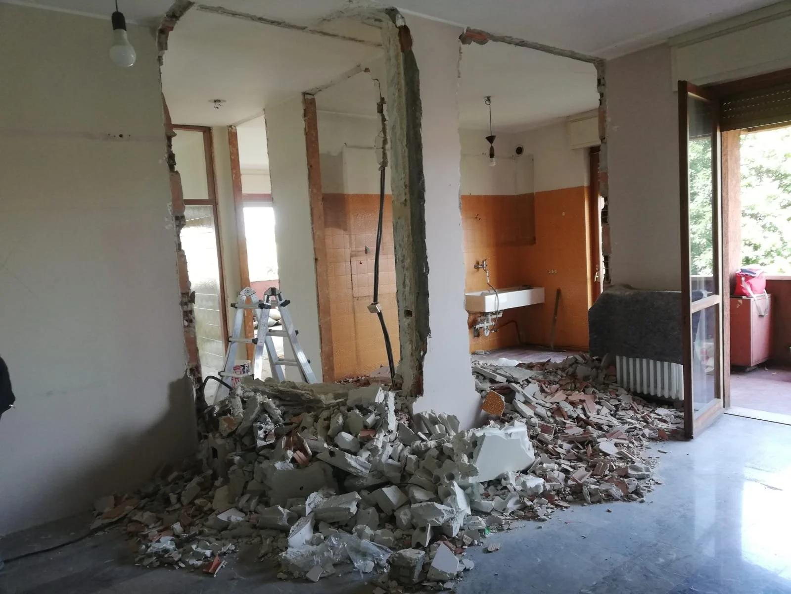 Rimozione di pareti divisorie, controsoffitti, pavimenti e altre strutture interne per ridefinire gli spazi abitativi.